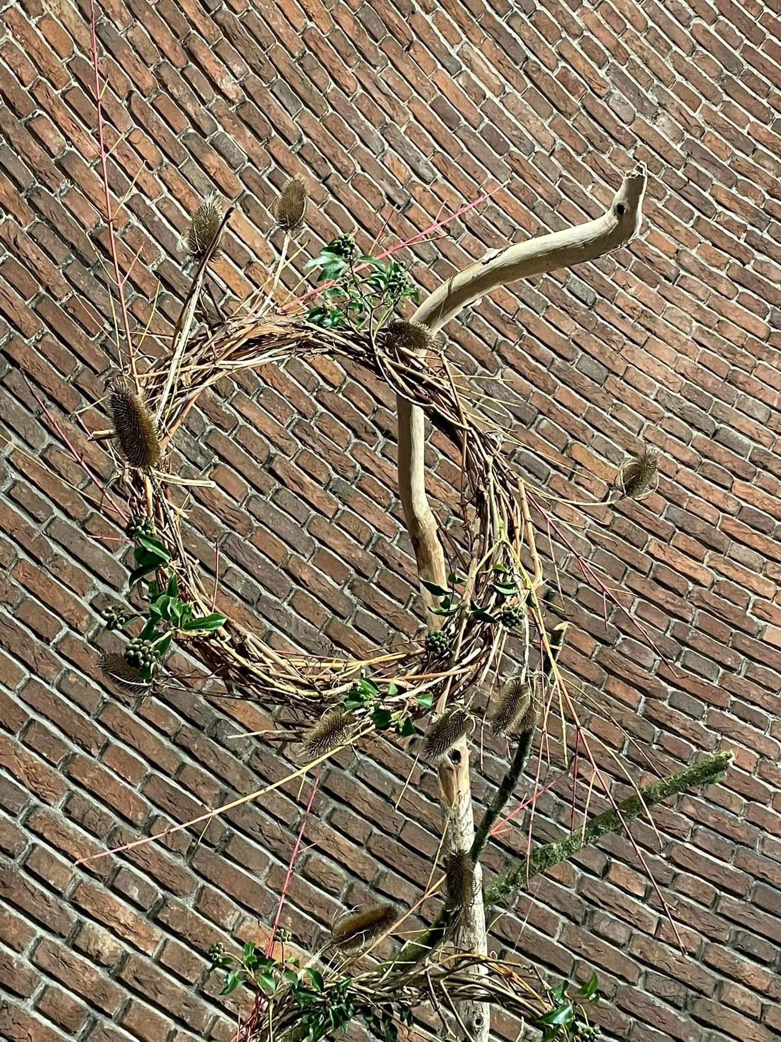 Door de cirkels zijn kaardenbollen geregen, ruig en stekelig, maar ook zij dragen een boodschap van kracht en hergeboorte. Ze zijn misschien scherp, maar hun aanwezigheid is ook zacht, een herinnering aan hoe moeilijkheden ons vormen, om ons uiteindelijk sterker te maken. En daartussen, glinsterend in het zachte licht, hangen hederabessen – kleine, jong-groene stipjes die de oneindige beweging van het leven in zijn kleinste vormen vertegenwoordigen.
