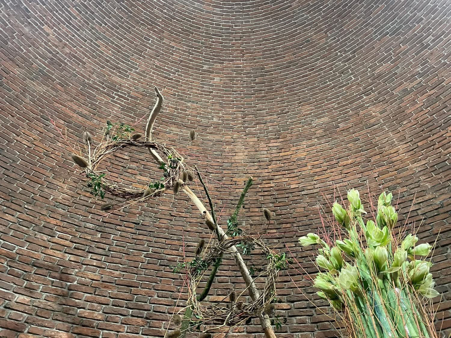 Rond de vaas, staan kornoeljetakken die verticaal aan elkaar zijn geregen. De takken zelf vertellen het verhaal van de oneindige cyclus van het leven – van herfst naar winter, van dood naar leven.