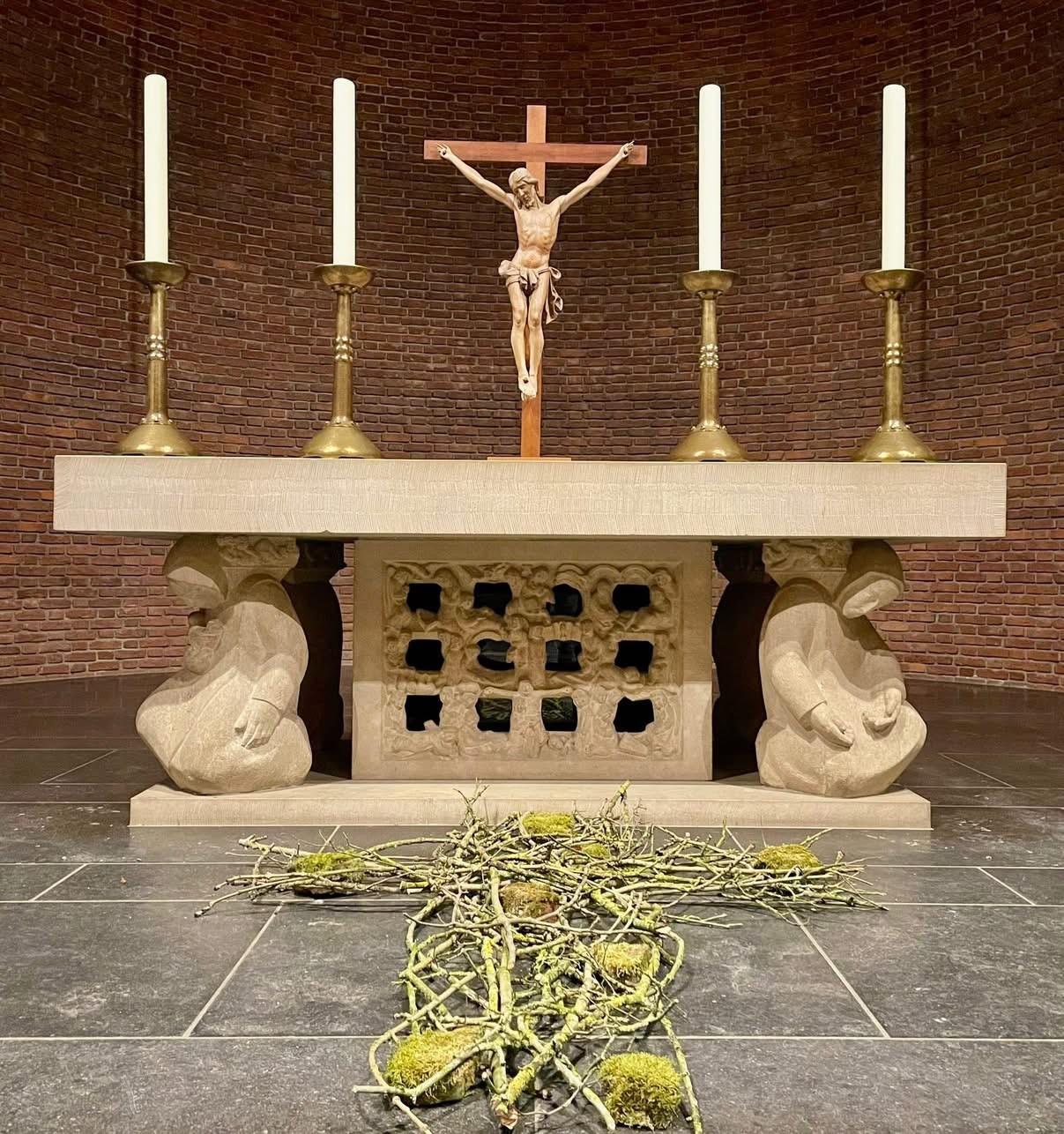 aan de voet van het kruis, gebeiteld in het altaar.